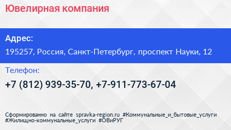 Ювелирная компания по адресу 195257, Россия, Санкт-Петербург, проспект Науки, 12 в дальнейшем Организация, размещена в следующих категориях: