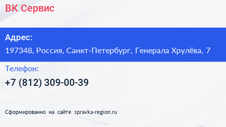 ВК Сервис по адресу 197348, Россия, Санкт-Петербург, Генерала Хрулёва, 7 в дальнейшем Организация, размещена в следующих категориях: