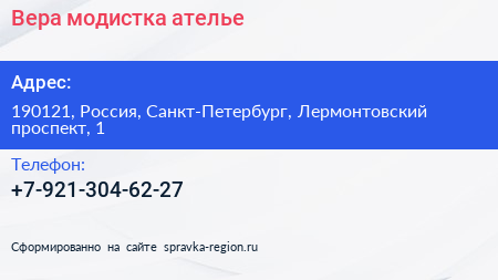 Вера модистка, ателье по адресу 190121, Россия, Санкт-Петербург, Лермонтовский проспект, 1 в дальнейшем Организация, размещена в следующих категориях: