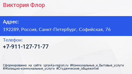Виктория-Флор по адресу 192289, Россия, Санкт-Петербург, Софийская, 76 в дальнейшем Организация, размещена в следующих категориях: