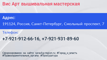 Вис-Арт, вышивальная мастерская по адресу 191124, Россия, Санкт-Петербург, Смольный проспект, 7 в дальнейшем Организация, размещена в следующих категориях:
