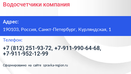 Водосчетчики, компания по адресу 190103, Россия, Санкт-Петербург, Курляндская, 1 в дальнейшем Организация, размещена в следующих категориях: