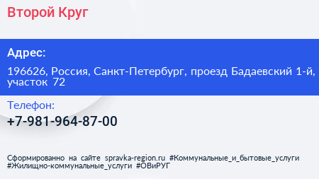 Второй Круг по адресу 196626, Россия, Санкт-Петербург, проезд Бадаевский 1-й, участок 72 в дальнейшем Организация, размещена в следующих категориях: