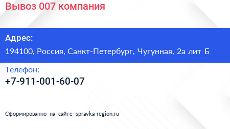 Вывоз 007, компания по адресу 194100, Россия, Санкт-Петербург, Чугунная, 2а лит Б в дальнейшем Организация, размещена в следующих категориях: