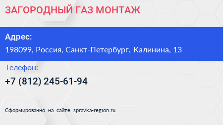 ЗАГОРОДНЫЙ ГАЗ МОНТАЖ по адресу 198099, Россия, Санкт-Петербург, Калинина, 13 в дальнейшем Организация, размещена в следующих категориях: