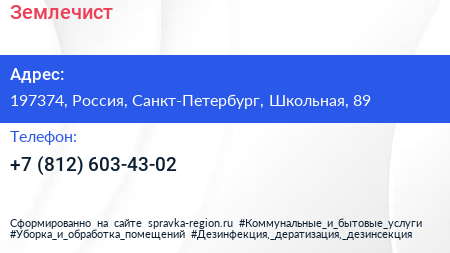 Землечист по адресу 197374, Россия, Санкт-Петербург, Школьная, 89 в дальнейшем Организация, размещена в следующих категориях: