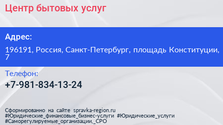 Центр бытовых услуг по адресу 196191, Россия, Санкт-Петербург, площадь Конституции, 7 в дальнейшем Организация, размещена в следующих категориях: