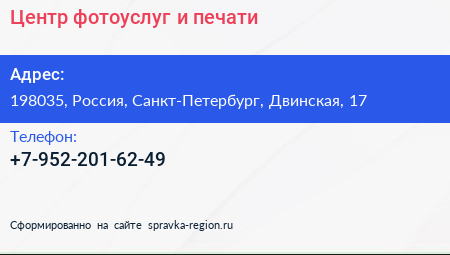 Центр фотоуслуг и печати по адресу 198035, Россия, Санкт-Петербург, Двинская, 17 в дальнейшем Организация, размещена в следующих категориях: