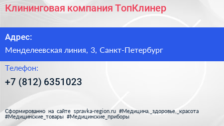 Клининговая компания ТопКлинер по адресу Менделеевская линия, 3, Санкт-Петербург в дальнейшем Организация, размещена в следующих категориях: