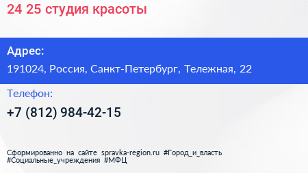 24/25, студия красоты по адресу 191024, Россия, Санкт-Петербург, Тележная, 22 в дальнейшем Организация, размещена в следующих категориях: