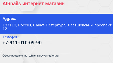 AIRnails, интернет-магазин по адресу 197110, Россия, Санкт-Петербург, Левашовский проспект, 12 в дальнейшем Организация, размещена в следующих категориях: