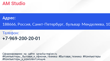 AM-Studio по адресу 188666, Россия, Санкт-Петербург, бульвар Менделеева, 10 в дальнейшем Организация, размещена в следующих категориях: