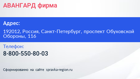 АВАНГАРД, фирма по адресу 192012, Россия, Санкт-Петербург, проспект Обуховской Обороны, 116 в дальнейшем Организация, размещена в следующих категориях: