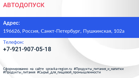 АВТОДОПУСК по адресу 196626, Россия, Санкт-Петербург, Пушкинская, 102а в дальнейшем Организация, размещена в следующих категориях: