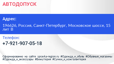 АВТОДОПУСК по адресу 196626, Россия, Санкт-Петербург, Московское шоссе, 15 лит В в дальнейшем Организация, размещена в следующих категориях: