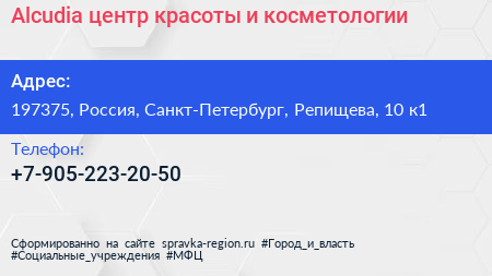 Alcudia, центр красоты и косметологии по адресу 197375, Россия, Санкт-Петербург, Репищева, 10 к1 в дальнейшем Организация, размещена в следующих категориях: