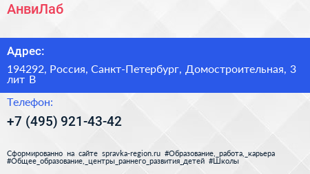 АнвиЛаб по адресу 194292, Россия, Санкт-Петербург, Домостроительная, 3 лит В в дальнейшем Организация, размещена в следующих категориях: