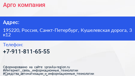 Арго, компания по адресу 195220, Россия, Санкт-Петербург, Кушелевская дорога, 3 к12 в дальнейшем Организация, размещена в следующих категориях: