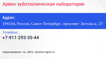 Арвен, зуботехническая лаборатория по адресу 194156, Россия, Санкт-Петербург, проспект Энгельса, 27 в дальнейшем Организация, размещена в следующих категориях: