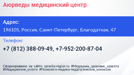 Аюрведы, медицинский центр по адресу 196105, Россия, Санкт-Петербург, Благодатная, 47 в дальнейшем Организация, размещена в следующих категориях: