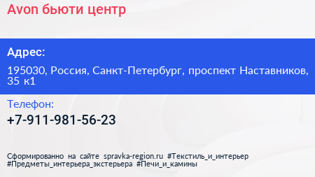 Avon, бьюти-центр по адресу 195030, Россия, Санкт-Петербург, проспект Наставников, 35 к1 в дальнейшем Организация, размещена в следующих категориях: