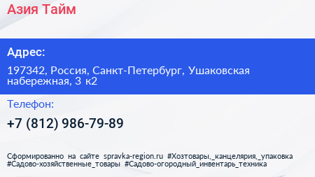 Азия Тайм по адресу 197342, Россия, Санкт-Петербург, Ушаковская набережная, 3 к2 в дальнейшем Организация, размещена в следующих категориях: