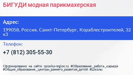 БИГУДИ, модная парикмахерская по адресу 199058, Россия, Санкт-Петербург, Кораблестроителей, 32 к3 в дальнейшем Организация, размещена в следующих категориях: