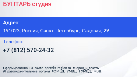 БУНТАРЬ, студия по адресу 191023, Россия, Санкт-Петербург, Садовая, 29 в дальнейшем Организация, размещена в следующих категориях: