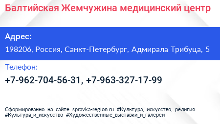 Балтийская Жемчужина, медицинский центр по адресу 198206, Россия, Санкт-Петербург, Адмирала Трибуца, 5 в дальнейшем Организация, размещена в следующих категориях: