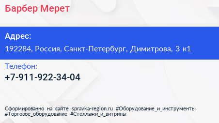 Барбер Мерет по адресу 192284, Россия, Санкт-Петербург, Димитрова, 3 к1 в дальнейшем Организация, размещена в следующих категориях: