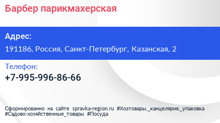 Барбер, парикмахерская по адресу 191186, Россия, Санкт-Петербург, Казанская, 2 в дальнейшем Организация, размещена в следующих категориях: