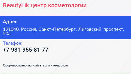 BeautyLik, центр косметологии по адресу 191040, Россия, Санкт-Петербург, Лиговский проспект, 50а в дальнейшем Организация, размещена в следующих категориях: