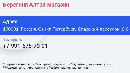 Берегиня Алтая, магазин по адресу 190031, Россия, Санкт-Петербург, Спасский переулок, 6-8 в дальнейшем Организация, размещена в следующих категориях: