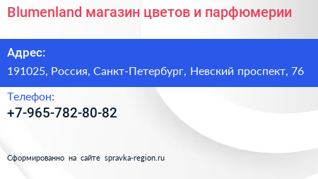 Blumenland, магазин цветов и парфюмерии по адресу 191025, Россия, Санкт-Петербург, Невский проспект, 76 в дальнейшем Организация, размещена в следующих категориях: