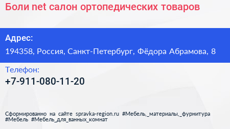 Боли net, салон ортопедических товаров по адресу 194358, Россия, Санкт-Петербург, Фёдора Абрамова, 8 в дальнейшем Организация, размещена в следующих категориях: