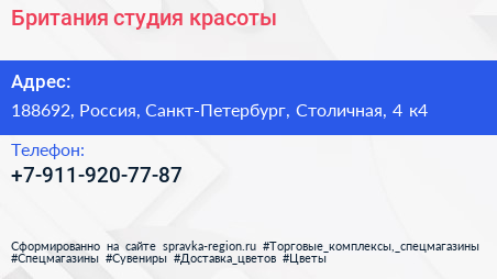 Британия, студия красоты по адресу 188692, Россия, Санкт-Петербург, Столичная, 4 к4 в дальнейшем Организация, размещена в следующих категориях:
