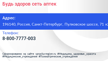 Будь здоров!, сеть аптек по адресу 196140, Россия, Санкт-Петербург, Пулковское шоссе, 71 к2 в дальнейшем Организация, размещена в следующих категориях: