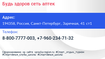 Будь здоров!, сеть аптек по адресу 194358, Россия, Санкт-Петербург, Заречная, 41 ст1 в дальнейшем Организация, размещена в следующих категориях: