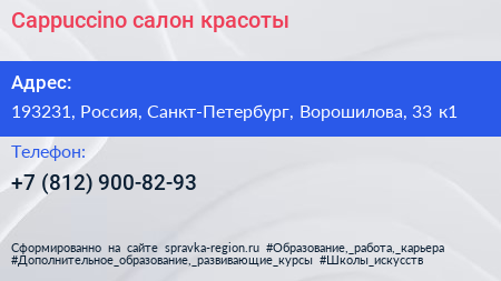 Cappuccino, салон красоты по адресу 193231, Россия, Санкт-Петербург, Ворошилова, 33 к1 в дальнейшем Организация, размещена в следующих категориях: