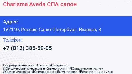 Charisma Aveda, СПА-салон по адресу 197110, Россия, Санкт-Петербург, Вязовая, 8 в дальнейшем Организация, размещена в следующих категориях: