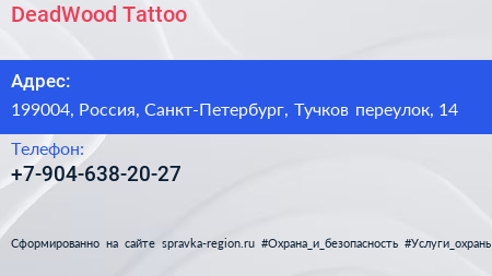 DeadWood Tattoo по адресу 199004, Россия, Санкт-Петербург, Тучков переулок, 14 в дальнейшем Организация, размещена в следующих категориях: