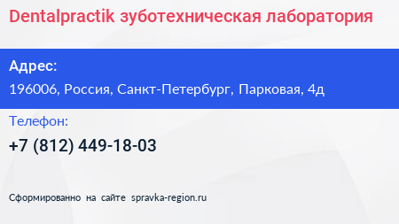 Dentalpractik, зуботехническая лаборатория по адресу 196006, Россия, Санкт-Петербург, Парковая, 4д в дальнейшем Организация, размещена в следующих категориях: