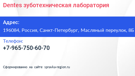 Dentes, зуботехническая лаборатория по адресу 196084, Россия, Санкт-Петербург, Масляный переулок, 8Б в дальнейшем Организация, размещена в следующих категориях: