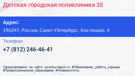 Детская городская поликлиника №35 по адресу 196247, Россия, Санкт-Петербург, Костюшко, 4 в дальнейшем Организация, размещена в следующих категориях: