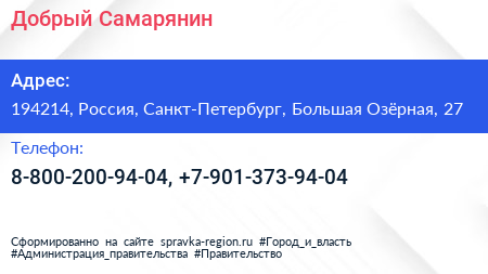 Добрый Самарянин по адресу 194214, Россия, Санкт-Петербург, Большая Озёрная, 27 в дальнейшем Организация, размещена в следующих категориях: