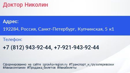 Доктор Николин по адресу 192284, Россия, Санкт-Петербург, Купчинская, 5 к1 в дальнейшем Организация, размещена в следующих категориях: