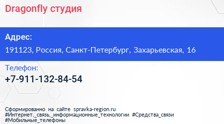 Dragonfly, студия по адресу 191123, Россия, Санкт-Петербург, Захарьевская, 16 в дальнейшем Организация, размещена в следующих категориях: