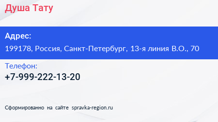Душа Тату по адресу 199178, Россия, Санкт-Петербург, 13-я линия В.О., 70 в дальнейшем Организация, размещена в следующих категориях:
