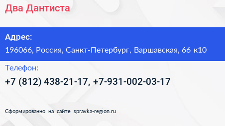 Два Дантиста по адресу 196066, Россия, Санкт-Петербург, Варшавская, 66 к10 в дальнейшем Организация, размещена в следующих категориях: