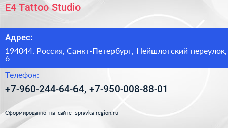 E4 Tattoo Studio по адресу 194044, Россия, Санкт-Петербург, Нейшлотский переулок, 6 в дальнейшем Организация, размещена в следующих категориях: